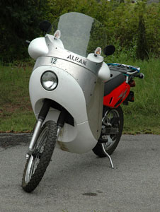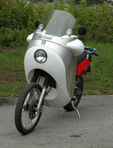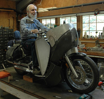 | Some responses to my appearance on Sidestandup, April 6, 2010: (click on Episode 170; I begin at 1 hr 26 minutes) Mr. Vetter: I just wanted to drop a line to you in response to your great interview on SideStand Up with Tom and Tim. I enjoyed listening to the interview and took some time tonight to read through much of your website. I personally love the overall look of the Alcan designs and think that despite what you said I think it has plenty of "style". I guess I am just a function over form sort of fellow and find things with function have style to me. I think that if you build it they will buy. I would be highly interested in one myself if it was within my slightly limited budget. I look forward to hearing future interviews with you on SideStand Up if you get the chance and I will be keeping my eye on the website for updates on the Alcan project. Thank you, Jason Thank you, Jason. Stay tuned Derek writes: Mr. Vetter, I just finished listening to your interview with Tim Yow on Side Stand Up. Your fairing design is very interesting. I'm a long distance rider and currently own an older KLR 650. I think it's a very interesting design. I like how you solved the clearance issue by making the top half rotate with the bars. If the price wasn't too much I would purchase one of these if available. You asked for some feedback so here is what I would be looking for in a fairing for my KLR. Would the fairing hold up in a low speed crash? Vetter answers: How could anybody answer such a question? The way I figure it is that the main structure is aluminum. It is not likely to catastrophically crack and let you down in an accident. Most likely, it could be pounded out on the road to get you home. Later it could be replaced cheaply. Would it protect the radiator/engine case/brake and clutch levers? Yes I use my KLR for gravel roads and anticipate going down occasionally. If the fairing could provide this protection it would solve the need to purchase all the other protection bits we end up buying. There is clearance to place a screen on the fairing, in front of the radiator. Good idea. Maybe I should install screens on ours before we depart. Would it be easy to remove the lower fairing for maintenance on the road? 4 screws. Easy. How much would it weigh? Don't know... have not weighed it. The aluminum is .100" thick. Certainly strong enough. Could it be thinner? Maybe. Then it would be lighter. We won't have an accurate weight until it is refined. Then we can weigh the stuff I take off, weigh the Alcan Fairing stuff we put on and get a net difference. I'd want a fairing that could be removed without too much trouble for the occasional roadside troubleshooting. Weight could be an issue on the KLR and lighter is always better off the paved road. You and I think alike. Different windshield heights would also be nice. Or better yet some type of adjustable shield. For now, different heights will have to be made. With a kit windshield you could make it the height you want. Kit vs finished? I'd prefer kit form to save a few dollars. As long as it didn't require any specialized tools or knowledge to build. A kit would probably be like 1950s model airplane kit... (the last time I made model airplanes) If it is a kit, the hard parts will be already formed. You gotta have some knowledge to build such a kit... like, can you use a sabre saw... drill holes... sand and paint, etc?. I wish you the best success with your new design and hope it makes it to market. Thanks, Derek Thank you, Derek. Even if Carol and I have the only two Alcans in the world, we will be happy. Really, it is a great fairing. | |||||||||||||||||||||||||||||||||||||||||||||||||||||||||||||||