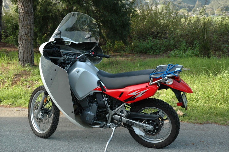 | Aluminum alloy is a good material for strength and durability. Witness the popularity of aluminum storage boxes on dual-sport bikes. Flat sides and simple radius curves and are inherently strong. This main frame made of aluminum is very strong. Plastic parts are supported by the aluminum frame have no stress on them. Here it is clipped together on my KLR. You get the idea. I am pleased that the same parts fit both the KLR and the BMW. The goal is to design a modern fairing that fits all bikes. | |||||||||||||||||||||||||||||||||||||||||||||||||||||||||||||||