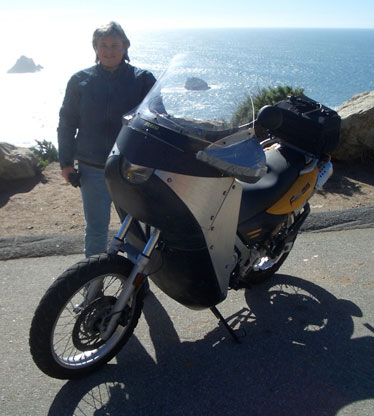 | The Alcan Fairing is - obviously - being developed for traveling the Alcan Highway. To start with, it must be rugged. Therefore, the basic structure is aluminum. I am assuming that it will be cold and rainy - all the way. Our son, Zak has put thousands of miles on the #7 Alcan Fairing prototype on his KLR, riding daily 25 miles to work. Recently, he has been riding in California's El Nino rain. He arrives absolutely dry! He has no rain suit, either. This is a good start. I am developing the Alcan Prototype #10 for Carol's BMW and #12 for my 2008 KLR. Yesterday, we took a test ride to Big Sur through its infamously blustery winds: | |||||||||||||||||||||