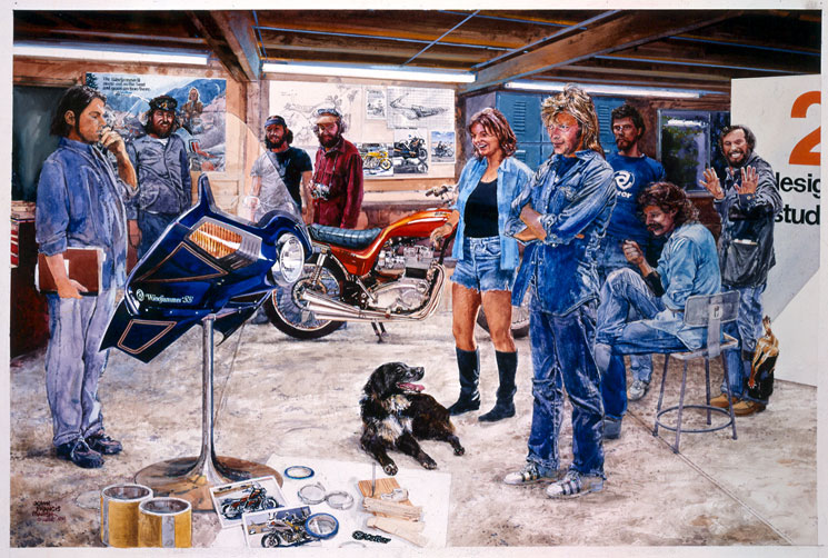 | Spring of 1976, Rantoul, Illinois: “Where Motorcycle Dreams Were Made” The 1970s were heady years for motorcycling. At Vetter, we doubled manufacturing every year, and still had a hard time keeping up with the demand for Windjammers. We were always behind. One day in 1976 (memorialized in the John Marsh painting above) Carol, who then was in charge of Vetter Dealers, informed me that Honda customers were not taking delivery of their bikes until Windjammers were installed. If you were Mr. Honda, could you afford to let that happen? Clearly, it would be just a matter of time before motorcycles would come from the factories with fairings on them. Working with Honda on their “Hondaline” fairing would have helped us all but, a disastrous fire at Vetter in early 1977 destroyed the Hondaline molds. Although it was a minor setback for their production, it had become clear to Honda that their Hondaline fairing was not going to be competitive with the Windjammer. Honda quietly dropped the project. | |||||||||||||||||||||||||||||||||||||||||