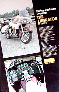 | The Liberator began when I made a call to Harley-Davidson in 1973. "Would they like a big, frame mounted fairing for the FLH?" The answer was yes and a "Fit-up" bike was made available. I had the name all along. The "Liberator" was the plane my daddy was crew chief on in WW II. I loved that airplane. | |||||||||||||||||||||||||||||||||||||||||||||||||||||||||||||||||||