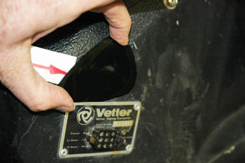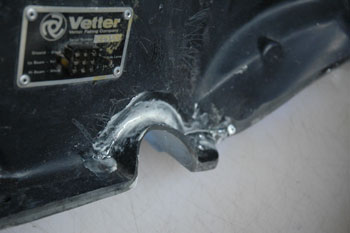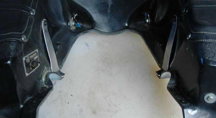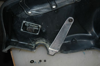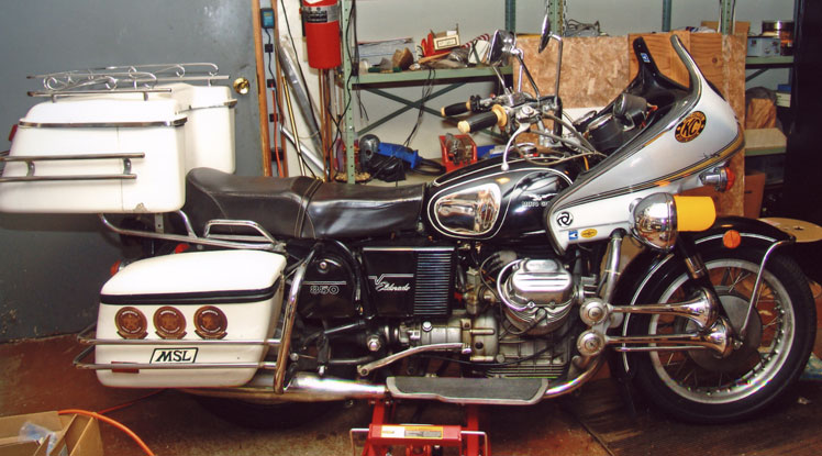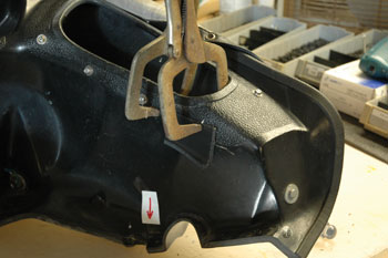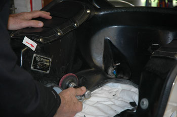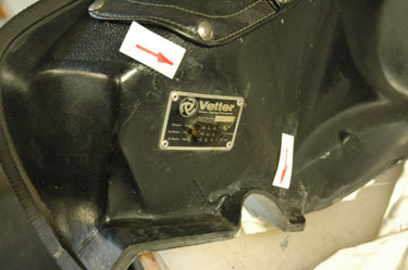 | There she is: John Thomas' Windjammer III, Serial # 45966 on his 1974 Guzzi parade bike. John is a member of the Minnesota Patriot Guard where he honors fallen veterans at their funerals and escorts the funeral procession to their burial site. Note the special cut-away for the crashbar. This is evidence this Windjammer was made for the Moto Guzzi. John's Windjammer had some cracks and I offered to fix them. Also, it would be a good opportunity to show you how, step- by-step, to repair your Windjammer with our Hotcha Repair Kit. Stuff you'll need: A little lacquer thinner to keep things clean. 5-6 latex gloves. A sheet of sandpaper to clean and roughen up the surface. A couple of "welders' Vice Grips." Time: I spent about 4 hours on this job. | |||||||||||||||||||||||||||||