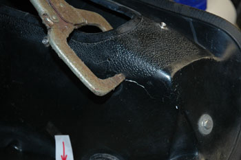 | These welder's Vice Grips make this job easy. If you don't have them, drill a couple of small holes tor 8-32 screws - or Pop Rivits to pull the patch and fairing surfaces together. The crack on the right was long so I used two patches. You can see how I used an extra scrap of ABS to force the surface into the shape it is supposed to be. | |||||||||||||||||||||||||||||