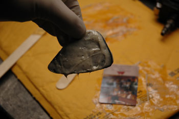 | Cut the patch as oversized as you can, round it out and sand a bevel on the side you might be touching if you reach inside the pocket. No use in leaving sharp edges to snag your fingernails. Mix up some more Hotcha Glue and slobber it onto the mating side. Yes... I use latex gloves on for this, too. | |||||||||||||||||||||||||||||