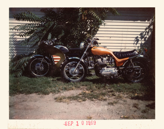 | This was an interesting day: I had just finished designing the Vetter/Rocket 3, which was to become the Triumph Hurricane of 1973. Behind the Vetter/Rocket 3 model is my Suzuki 500 with a specially painted stars and bars Series 1600 Fairing. It was my favorite paint job. I always bought the biggest two stroke street bike I could. | ||||||||||||||||||||||||||||||||||||||