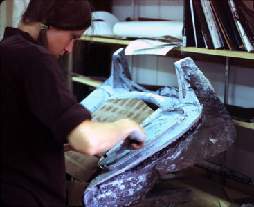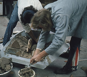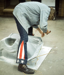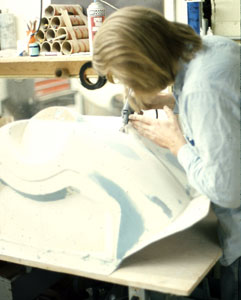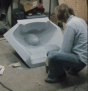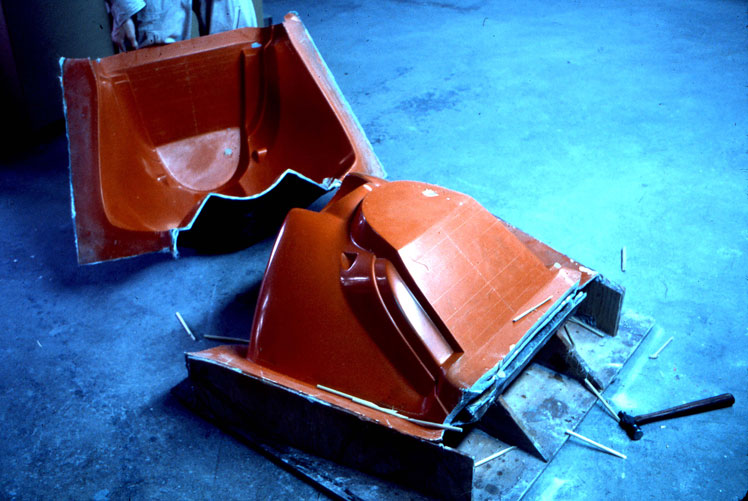 | Separating the mold There I am with wooden wedges, trying to separate the fiberglass from the brown designer's clay inside. | |||||||||||||||||||||||||||||||||||||||||||||||||