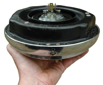 | The Delco-Guide H-18, 7" headlight assembly In 1970, there was no standard motorcycle headlight. Just like today. This made it very hard to mount fairings. What if I put my own headlight in the Windjammer? I could pre-wire it into its own wiring harness with a quick-disconnect plug. Mounting and removing the fairing would be a snap. This Delco unit had been used since the 1950s in GM cars and had now found its way onto trucks. Delco made up a special version for us with a motorcycle certified bulb and sold it to us for about $9.00 each. A similar Guide H-18 was also used on Harley-Davidson Big Twins between 1960-83. Perhaps parts from the H-D Guide unit can be used in Windjammers of 1972-7. The built-in headlight was going to make it easy to put a Windjammer on any motorcycle. This was revolutionary. | |||||||||||||||||||||||||||||||||||||||||||||||||