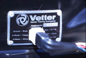 | Of course, we made special side decals The first electrical plugs were 6 prong. The holes were hand-filed rectangles. Serial numbers were scratched into the fairing. Beginning November 1971, we Pop-Rivited aluminum plates onto the inside left side. These plates had serial numbers stamped into them. I got number 1000 for mine. | ||||||||||||||||||||||||||||||||||||||||||||||||||||||||||||||||