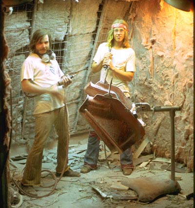 | Did you know that your Windjammer was held together with clothespins while the glue hardened? You probably did not know that your Windjammer was routed (trimmed to shape) by Bob Nelson, aka "Johnny Rout" or Craig Coy, aka "CC Fairingwright" They played their air routers like musical instruments. To the left, Johnny Rout is "strumming" his router like Johnny Cash strummed his guitar. Almost everybody came directly out of highschool. Like me, they had never worked for anybody else. We made it up as we went. It wasn't hard. People rise to the ocasion when they are given the authority to do their job... even when they are only 18 years old. | ||||||||||||||||||||||||||||||||||||||