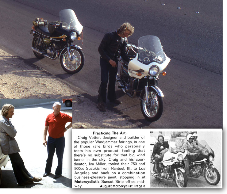 | Bob Greene had been in motorcycling for a long time and was much respected. More than one person suggested that I meet him and show him what I was doing. Toruble was, he was in California and I was in Illinois. No problem. In May, Jim Miller and I rode out to meet him, doing the round trip in 10 days. Wow! This was in the middle of America's gas crises. Gas cost $.50 a gallon. While our political leaders allowed car owners to buy only a few gallons at a time on odd / even days, motorcyclists could buy all we wanted. This helped to make motorcycles popular. It made Windjammer Fairings popular too because Windjammers allowed riders to ride more. This was Jim's first and last long distance ride. He was happier cooridinating production at the factory in Illinois. I preferred to design and ride. We made a good team. As I recount this story I can't help but wonder: How did we do all this stuff? How could we move into a new building in a couple of days - and then... how could we afford to leave it to take an transcontinental motorcycle trip? How did we ride to California and back in 10 days? It boggles my mind. | ||||||||||||||||||||||||||||||||||||||