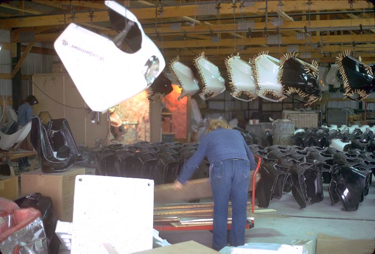 | Not only did I design the fairings, I designed the factory, the jigs and fixtures and work stands, too. For the work stations, I recycled our 55 gallon drums, cutting them in half and filling them with sand. Each station operator was encouraged to customize his own. They could be slid around easily to be re arranged. These work stations were in continuous use thru the last days of Windjammer production. | ||||||||||||||||||||||||||||||||||||||