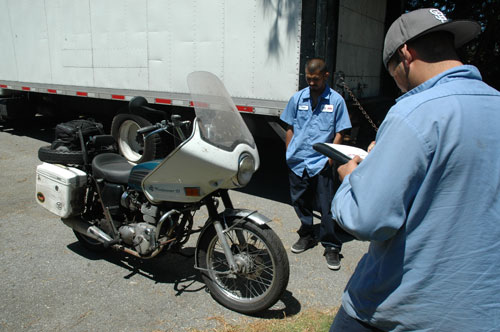 | August 11, 2011: They have come to take it home. I made it very clear that nobody was to touch this bike or wipe it off. Every bug had a story. The amazing thing is that it did not leak oil while it was parked at my shop! | ||||||||||||||||||||||||||||||||||||||||||||||||||||