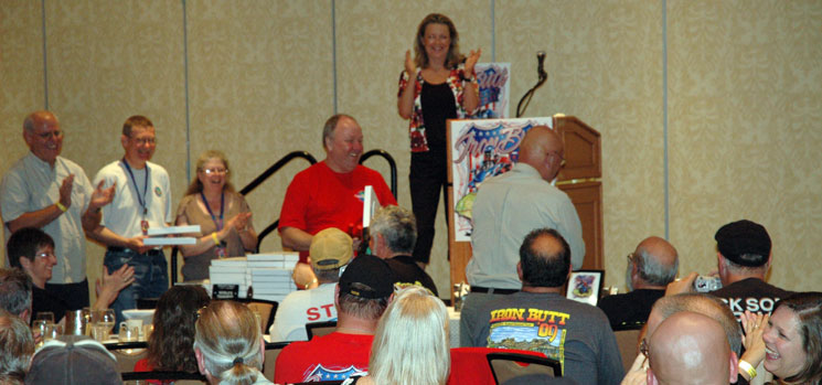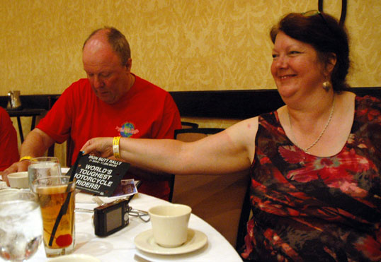 | Right off, Bob Higdon, Brilliant Butt Spokesman introduced himself as Sally. Seems that at the beginning of the Rally in Seattle, he was heard to say: "If that bike makes it out of the parking lot, you can call me Sally" Sally - back to us in the grey - and and Lisa on stage present John with his awards. | ||||||||||||||||||||||||||||||||||||||||||||||||||||