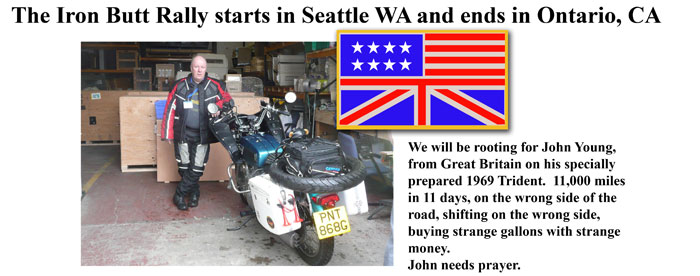 | John on his 42 year old Triumph was the first rider out - on a trip that will take him from Seattle to Buffalo to Jacksonville to Ontario, CA. | ||||||||||||||||||||||||||||||||||||||||||||||||||||