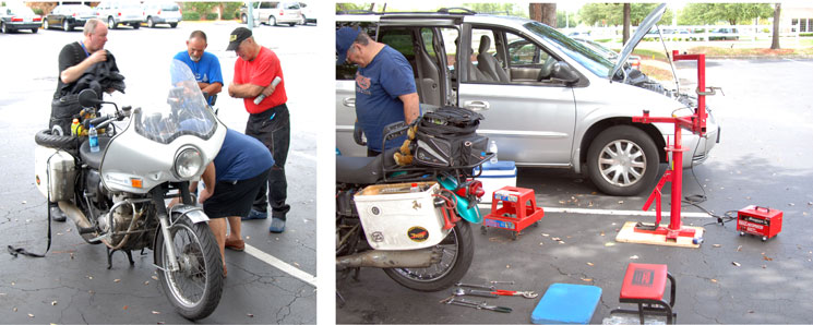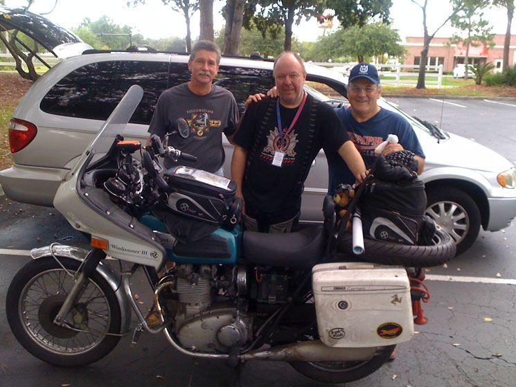 | John arriving at the Jacksonville Florida checkpoint First words out of John's mouth: "This was a mistake" Monday, June 27: "I think he's lost weight" (first words from his wife's mouth) "The Windjammer looks good" (first words out of my mouth) Left: Chris Alley, Wiz of Mercedes-Benz (ret) and long-time motorcyclist, knows everything about working on bikes and cars. Brought all tools in his van, including tire changing equipment. Right: Val Horton, Experienced and skilled engineer, racer and wrench. From South Africa, so he speaks British! Bill Robinson of Jacksonville, ( "B7" to his friends ) says: "Craig, these are two of the finest and most dependable guys I know, and I am confident that John will be in very good hands. I'll get down to the Ramada Inn as soon as I can to see if John needs anything else." "Our guys will take good care of him." | ||||||||||||||||||||||||||||||||||||||||||||||||||||