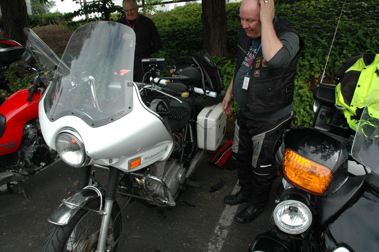 | Friday, June 24: John completed his first leg from Seattle to Buffalo, arriving inside his alloted time window. It seems that his biggest problem has been that he lost his big yellow UK license plate somewhere in Missouri when his chain let go and tore it off... in the rain... in the dark. This caused some delays from interested state troopers. Sunday night, June 26: Carol reported to friends waiting to help in Jacksonville: "He is stopping for the night in Savannah. He is exhausted. His plan is to be at the hotel in Jacksonville by 8:30 a.m. Apparently he cannot leave the bike when it is being worked on. He can have help (that's you) but he needs to be there, so he is going to just nap on the ground while you all do what you do. Sonia says he does this all the time.... Oh and he hopes you found the right oil..... silly man" | ||||||||||||||||||||||||||||||||||||||||||||||||||||